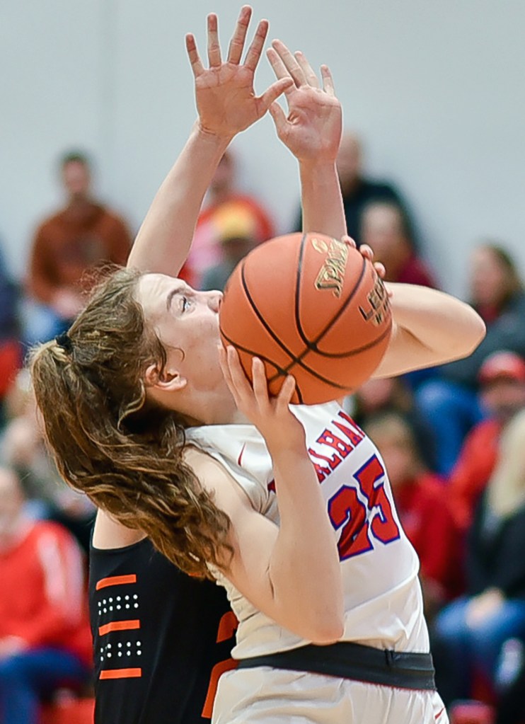 Five Cardinals scored in a fast-paced 1st quarter. Rowen Fisk opened the scoring with a putback, Lily Conry stole the ball in the front court and went coast-to-coast for a layup-and-one, Kenna Harskamp made a 3-pointer, and the Cards led 8-3. Conry scored two more times in the lane, Avrie Fagan hit 2 3-pointers, and Darby Moore made a layup after a steal. The Trojans’ one scoring option, junior Joelle Johnson, kept them in the game, though, with 3 3-pointers and a deuce. The Cards led after 1, 20-14.