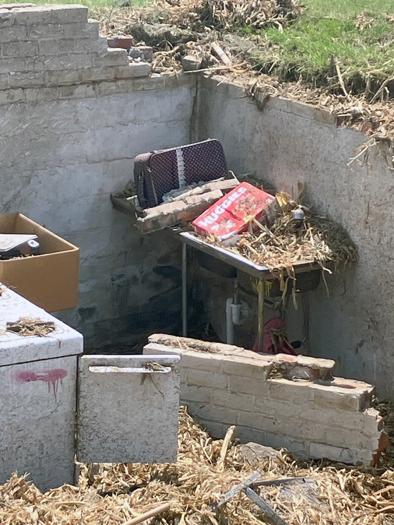 While Abbey shielded Henry, a large, heavy chunk of a brick wall fell onto her back. In the immediate aftermath, Paul shoved it off of her. She was in pain, but she and everyone got up right away and climbed up the stairs out of the basement. Their house was gone.