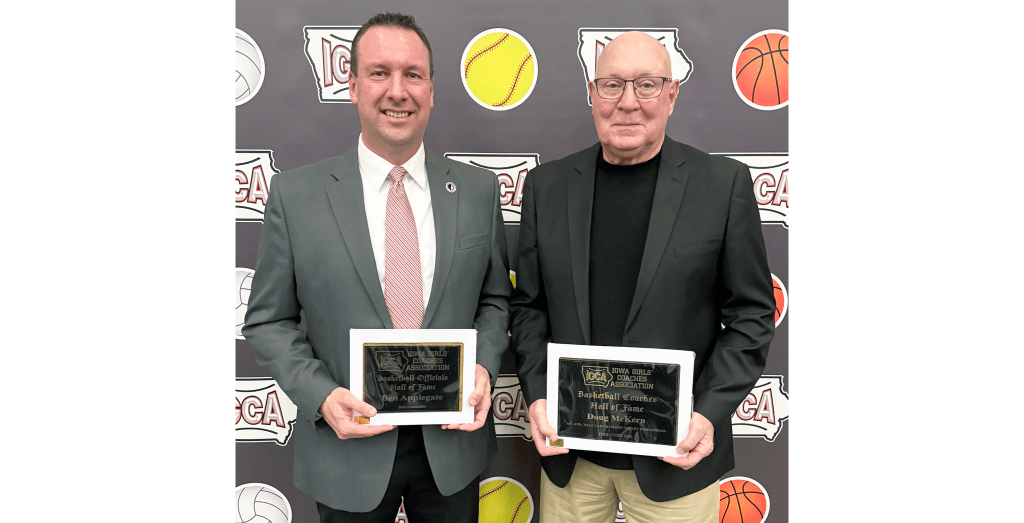 Ben Applegate and Doug McKern, both of Earlham, were inducted into the Iowa Girls Coaches Association (IGCA) Hall of Fame last Saturday at a ceremony in Cedar Falls. The Hall of Fame honors the coaches, officials, and contributors who have helped shape girls’ high school athletics across the state of Iowa.